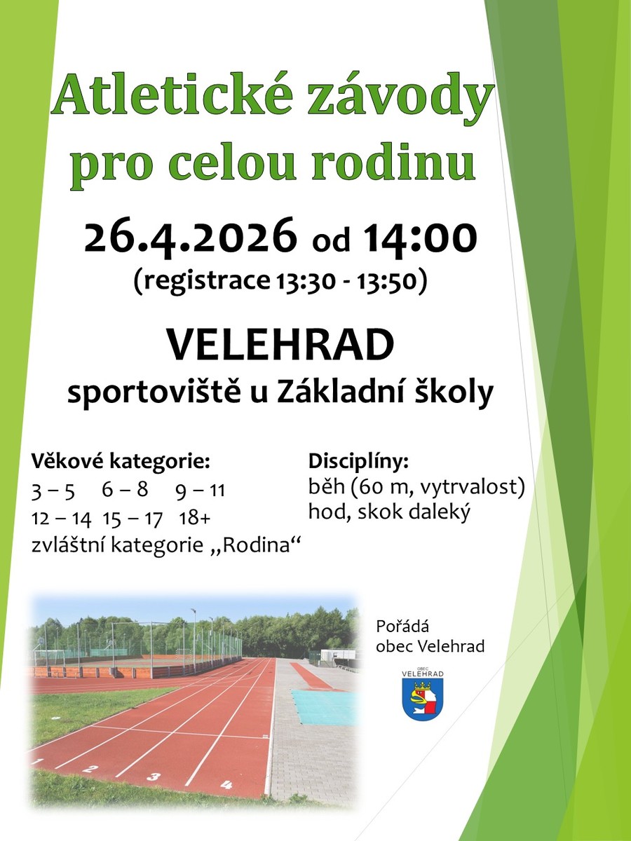 V neděli 26. dubna 2026 od 14 hodin na sportovišti u základní školy se budou konat Aatletické závody pro všechny věkové kategorie (+ rodina).