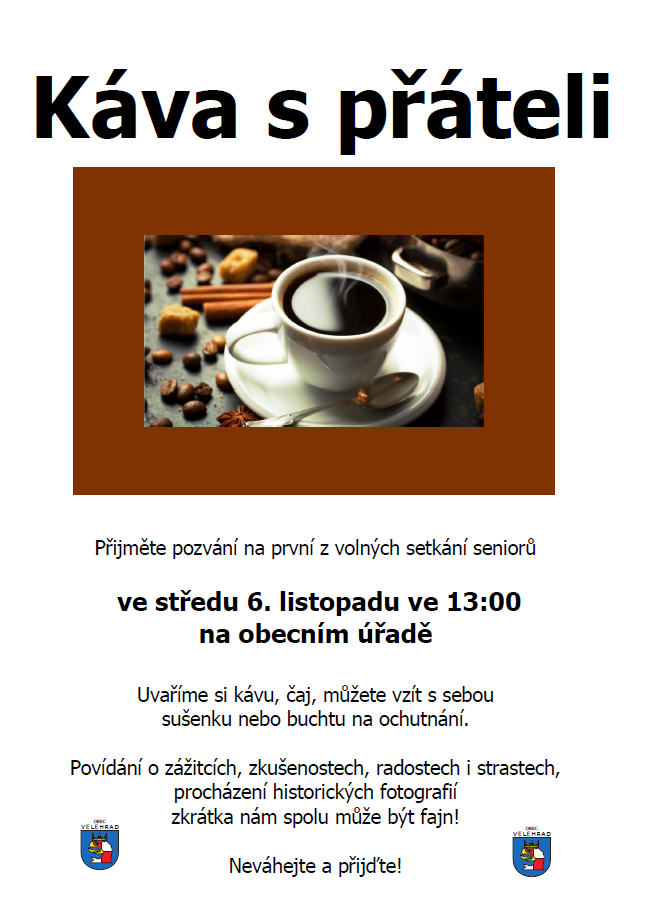Přijměte pozvání na první "Kávu s přáteli" - volné setkávání seniorů na obecním úřadě. Ve středu 6. listopadu ve 13 hodin. A další středu třeba zase - podle zájmu a nálady.