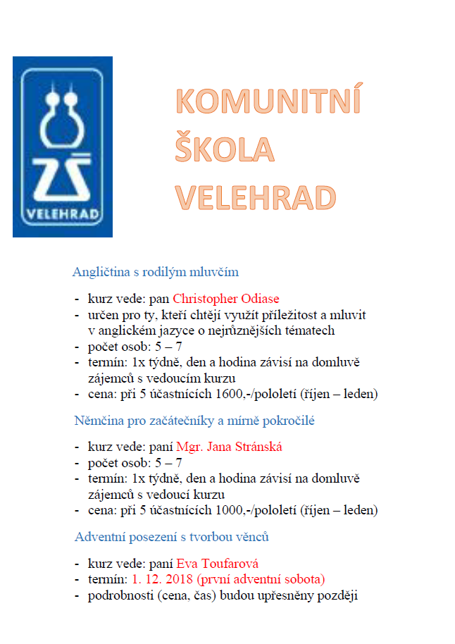 Nabídka kurzů v rámci Komunitní školy Velehrad pro rok 2018 / 2019