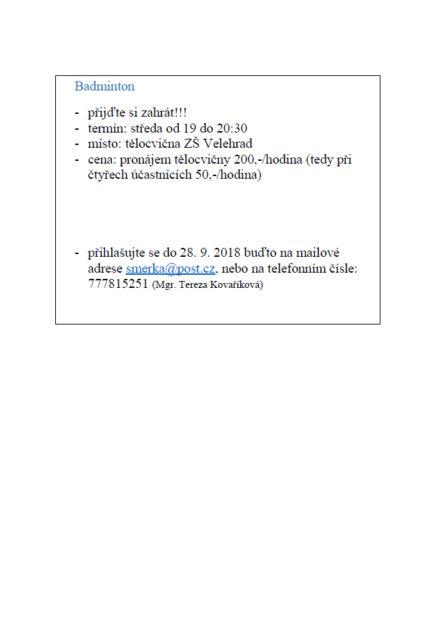 přihlašujte se do 28. 9. 2018 buďto na mailové adrese smerka@post.cz,