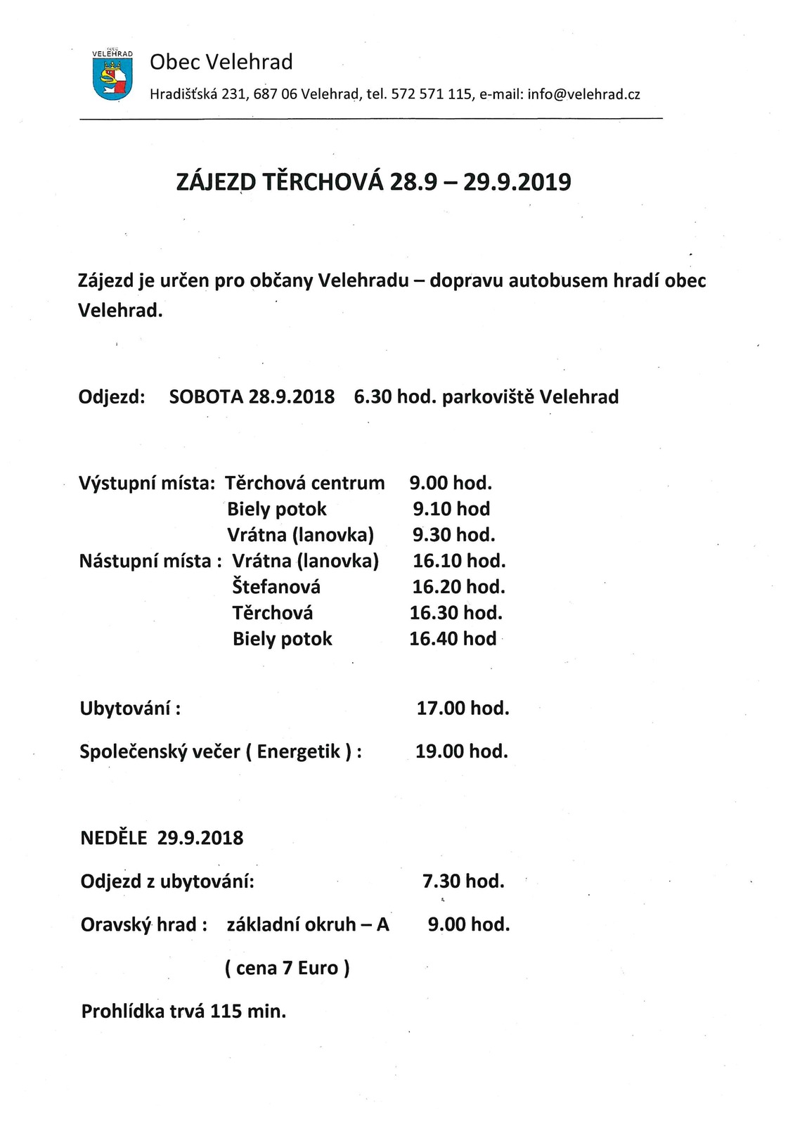Obec Velehrad opět letos organizuje zájezd do spřátelené Těrchové - ve dnech 28. až 29. září 2019.