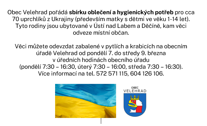 Obec Velehrad pořádá sbírku oblečení a hygienických potřeb pro cca 70 uprchlíků z Ukrajiny (především matky s dětmi ve věku 1-14 let).