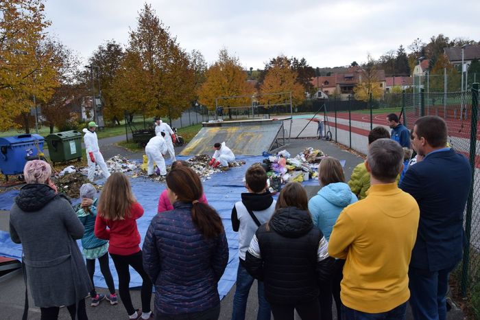 V pátek 18. října starosta společně se zastupitelem a pracovníky obce udělali namátkový rozbor komunálního odpadu. Svezen byl odpad ze 20 náhodně vybraných černých popelnic umístěných před domy v různých ulicích Velehradu. V odpadu, který už měl být roztříděn, byla pouze polovina směsného odpadu. Jednu třetinu zaujímal biodpad. Další vytříditelné odpady tvořily téměř jednu pětinu celkové váhy. Starosta debatoval s dětmi ze základní školy o odpadovém hospodářství a předcházení vzniku odpadu. Zástupci školního parlamentu pak na vlastní oči viděli roztříděný odpad a nabyté informace a zkušenost budou předávat svým spolužákům ve škole.